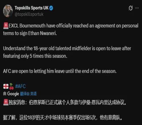 因此,恩瓦内里希望外租获得更多比赛时间,樱桃军团成为潜在下家。这位18岁的球员被形容为“现象级的天才”,原本指望续约后能获得更多机会,但自从埃泽加盟后,他的出场时间便大幅缩水。尽管本赛季马杜埃凯、马丁内利、萨卡、特罗萨德和厄德高等人先后遭遇伤病,恩瓦内里依旧不受阿尔特塔的信任,出场时间骤降。