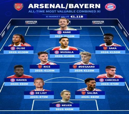 北京时间11月26日,在阿森纳和拜仁慕尼黑即将在欧冠进行直接对话的情况下,德转列出了两家俱乐部历史最贵的11人阵容,2024年身价曾经达到1.5亿欧元的萨卡领衔,哈里-凯恩、穆西亚拉
