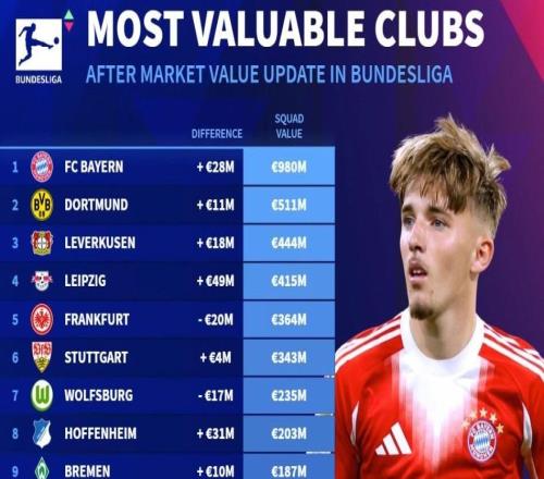 德甲俱乐部身价榜:拜仁9.8亿欧断档领先,海登海姆5380万最低