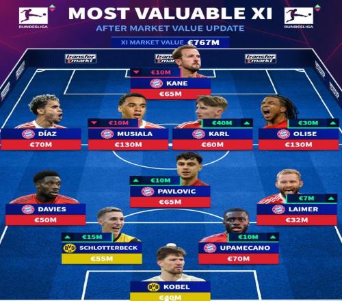 北京时间12月19日,在更新了德甲球员的身价之后,德转还列出了此次更新后身价德甲最贵的11人阵容,拜仁慕尼黑9人上榜,多特蒙德2人入围,穆西亚拉和此次更新身价暴涨3000万欧元的奥利